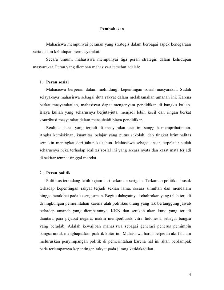 Hal ini dikarenakan mahasiswa memiliki potensi serta kelebihan yang tentu saja tidak bisa disamakan dengan rakyat biasa, terutama dalam hal perjuangan. Peran mahasiswa • pemberantasan korupsi (terutama pencegahan) perlu melibatkan peran serta masyarakat , termasuk mahasiswa. (sistem pendidikan) tn50 aspirasi mahasiswa dalam pembangunan negeri sabah 2017 assalammualaikum dan selamat sejahtera kepada semua penonton video saya hari. Pendahuluan dalam sejarah indonesia, mahasiswa yang merupakan generasi penerus bangsa. 5 peran mahasiswa dalam berbangsa dan.